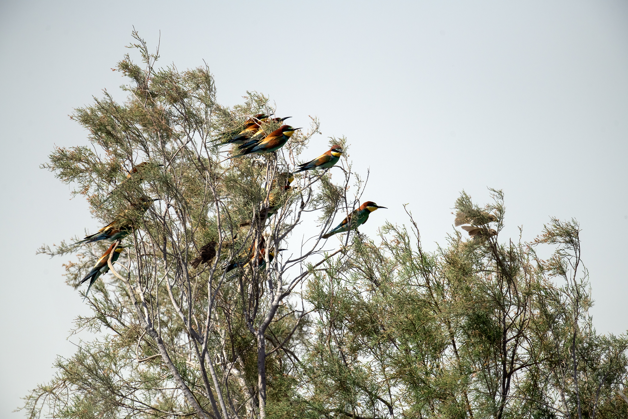 calls. Habitat & Behavior The European Bee-eater is highly adaptable and thrives in both urban and rural environments: Urban Areas: Frequently seen flying over swimming pools, gardens, or perched on aerials and power lines. Rural Areas: Hunts flying insects in fields and plantations, often perching on tree tops or resting briefly on the ground. They primarily feed on flying insects such as bees, grasshoppers, dragonflies, and butterflies. After catching prey, they remove stings by striking the insect against a branch or similar hard surface. The European Bee-eater is highly vocal and social, often gathering in flocks. Appearance & Physical Characteristics Brightly colored, with hues that include nearly every color of the rainbow. Appears as a black, delta-winged silhouette in flight, with its vibrant colors becoming visible when perched. Call Their call is a soft, repetitive "croop croop," lower-pitched and less hoarse than the call of the Blue-cheeked Bee-eater. It is commonly heard as they circle in flocks. Size and Comparison The European Bee-eater is medium-sized and slightly smaller than the Blue-cheeked Bee-eater. Its bright plumage and characteristic flight patterns make it one of the most recognizable migratory birds. Seasonal Presence The European Bee-eater migrates through Qatar: Spring: Arrives in late March to early April, signaling the end of winter. Autumn: Returns during September and October as it migrates back to its wintering grounds in Africa. The European Bee-eater’s dazzling colors, lively behavior, and melodious calls make it one of Qatar’s most striking seasonal visitors. |