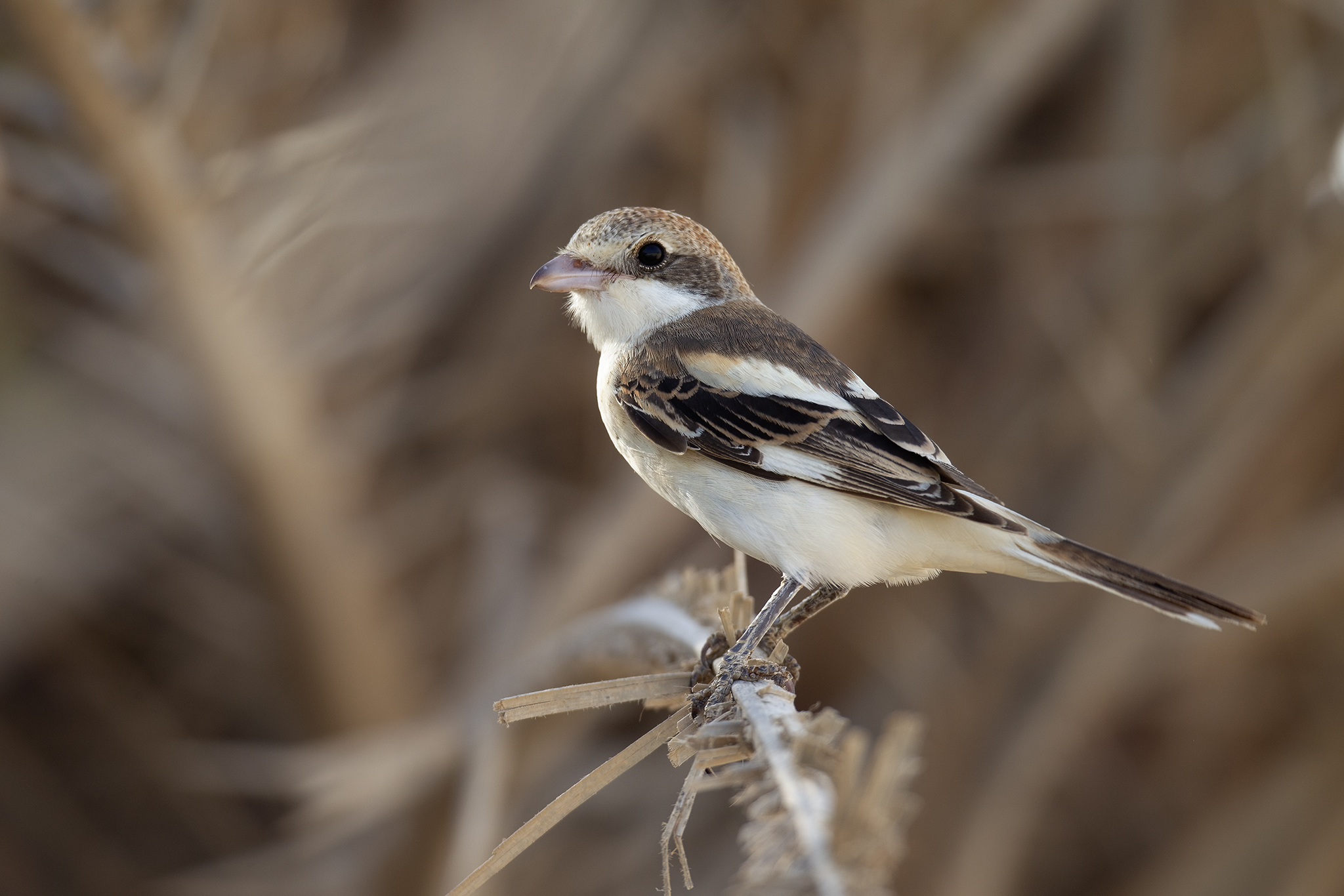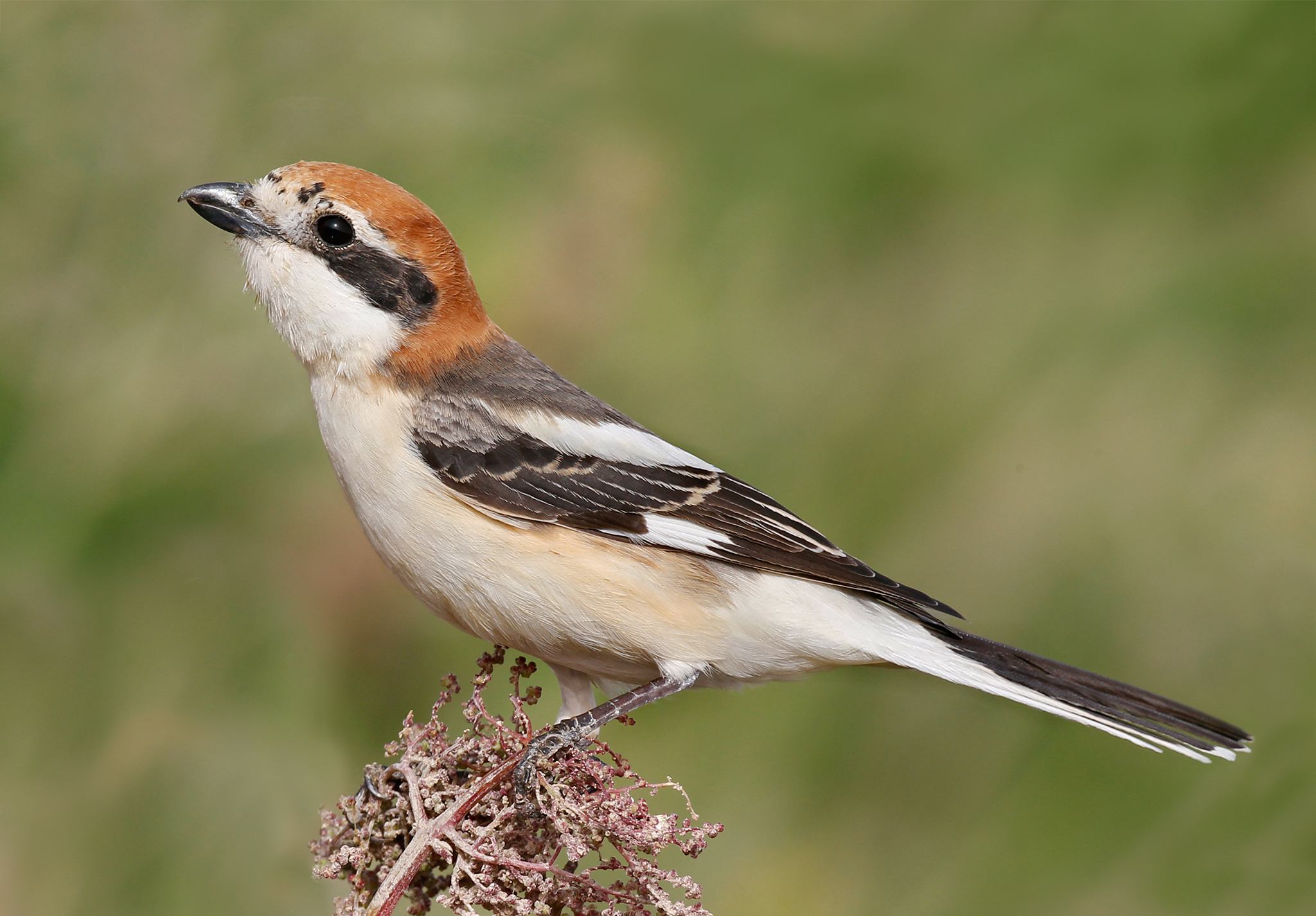 A spring and autumn passage migrant of open country, bushes and fields. Its black and white plumage with chestnut red cap make it easy to identify. Females are similarly patterned to males, though slightly duller in colouration. Like all Shrikes, it sits on a prominent perch waiting to grab insects, small reptiles and occasionally birds. When disturbed it will disappear deep into the cover of a bush or tree. It is usually silent while on migration.